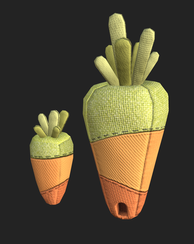 From the alternative controller project, Plushie Blaze, I decorated and painted the terrain for our starting area called Veggie Village. My work included creating some of the 3D assets that were placed, to placing fabric patches, to creating a special shader to simulate what a "waterfall of ribbons" could look like. All the individual assets shown below were modeled, UVed, and Textured by me.